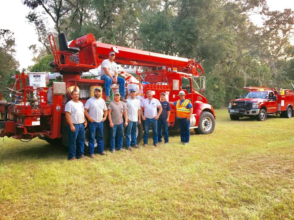 The men worked as much as 16 hours per day repairing broken poles and wire damaged by powerful wind and falling trees. In Florida they carried tools through chest-deep water, keeping a wary eye out for alligators. The Georgia crews braved venomous snakes and the ever-present fire ants.