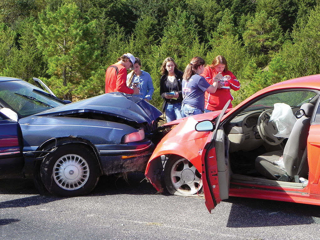 Members of the Houston High School Constitution Project crime scene investigation team interview mayor Don Tottingham during a practice session at a mock automobile accident last Thursday at Thomasville Road and Holder Drive. Tottingham was posing as a fictitious man named “Ralph Sanders,” the driver of a stolen vehicle that had caused the wreck. Students, from left: Kylie Lane, Savannah Cope, Charlee Sue Jadwin and Taylor Chipps.